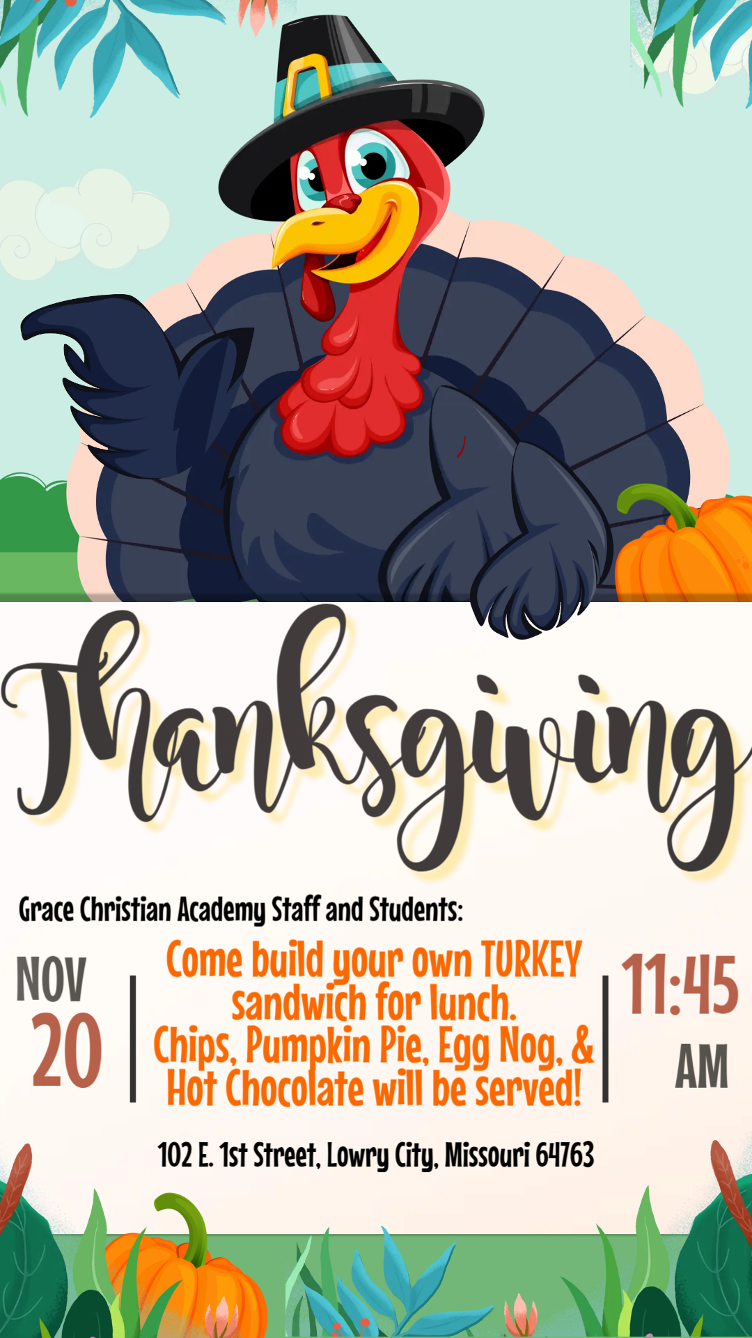 Date Nov 05 2025 Expired! Time 8:00 am - 6:00 pm Thanksgiving Lunch 2025 Gobble up some good eats with the great staff and students of GCA! Share this event + Add to Google Calendar + iCal / Outlook export